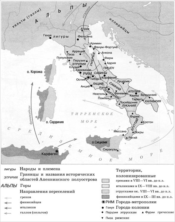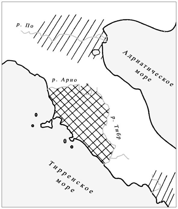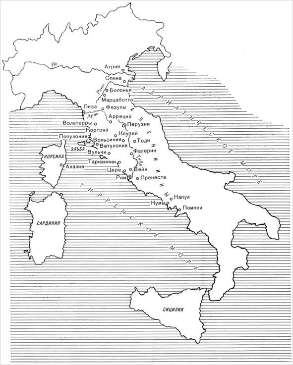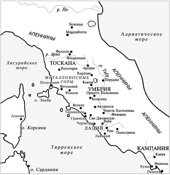 Ниже на картах 1–6 представлены территория и племена Древней Италии, а также территория расселения этрусков и их города.