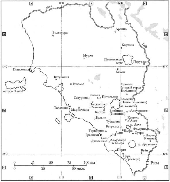 Название Этрурии много раз менялось… Прибывших сюда поселенцев называли тирренами — по имени одного из их царей, — а затем тусками — по греческому обозначению их обычая приносить жертвоприношения.