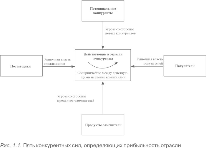 Первым основополагающим фактором прибыльности компании является притягательность отрасли. Конкурентная стратегия должна разрабатываться на основе всестороннего понимания правил конкурентной борьбы, которые и определяют привлекательность или прибыльность того или иного вида бизнеса. Конечная цель конкурентной стратегии состоит в том, чтобы овладеть этими правилами, а также — в идеале — быть способными изменять их в интересах компании. В любой отрасли, будь то отрасль национального или международного масштаба, производство товаров или сфера услуг[9], правила конкуренции заключаются в пяти движущих конкурентных силах: выход на рынок новых конкурентов, угроза со стороны субститутов, рыночная власть покупателей, рыночная власть поставщиков, соперничество между действующими на рынке конкурентами (см. рис. 1.1).