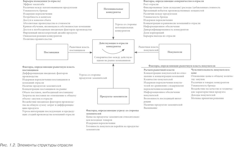 Интенсивность действия каждой из этих сил определяется структурой отрасли[10] или лежащими в основе экономическими и техническими особенностями отрасли. Ее важнейшие элементы представлены на рис. 1.2. Структура отрасли относительно стабильна, но может со временем изменяться по мере ее (отрасли) развития. Изменения структуры сказываются как на абсолютной, так и на относительной интенсивности каждой из пяти сил, и соответственно положительно или отрицательно влияют на прибыльность всей отрасли. Для выработки стратегии наиболее важными являются те тенденции развития отрасли, которые оказывают воздействие на структуру отрасли в целом.