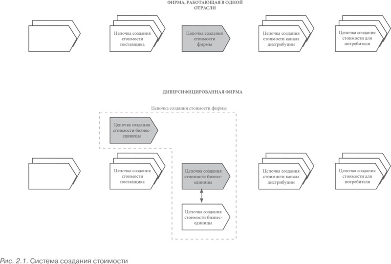 В главе 2 вводится понятие цепочки создания стоимости и показывается, как это понятие можно использовать для фундаментального анализа конкурентных преимуществ. В этой главе будет рассказано о том, как выделить в составе фирмы те виды деятельности, которые лежат в основе конкурентных преимуществ, и выявить те связи между этими видами деятельности, которые составляют ядро конкурентных преимуществ. В этой главе я также объясняю значение сферы конкуренции и ее влияние на цепочку стоимости и рассказываю о том, как путем создания коалиции с другими компаниями можно найти замену некоторым видам деятельности, которые до этого осуществлялись бизнес-единицами в составе корпорации. В главе 2 будет кратко сказано об использовании понятия цепочки создания стоимости при разработке организационной структуры.