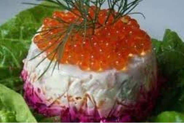 Ингредиенты: 400 грамм малосольной красной рыбы, 50 грамм красной икры, 200 грамм очищенных и отваренных креветок, 2 картофелины, 1 свекла, 1 авокадо, 1 лимон, 3 столовых ложки сметаны, 3 столовых ложки сметаны, свежая зелень петрушки Для украшения.