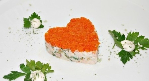 Приготовление: морковь, лук, горбушу нарезать мелкими кусочками, яйцо размять вилкой, зелень (по вкусу) мелко измельчить. Посолить, поперчить, добавить майонез, смешанный с лимонным соком и перемешать. Выложить салат в любую формочку. Сверху выложить слой на
