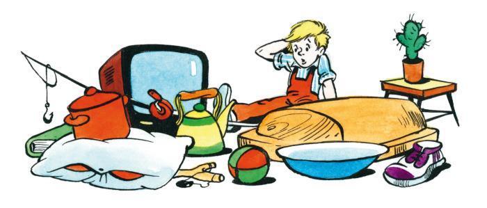Ребята носились по школе, как угорелые, и собирали всё необходимое для космического полёта. Больше всех волновался Прутик. Он боялся что-нибудь забыть и поэтому тащил в «Дрындолёт» всё, что ему попадалось под руку: чайник, удочку, лопату, грабли, медный таз, кастрюлю, подушку, корыто и многое-многое другое. Увидев всё это безобразие, Самоделкин велел мальчику немедленно вытряхнуть всё из «Дрындолёта» и взять только самое необходимое.