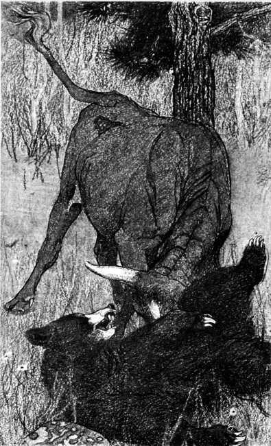 One day, as he lay asleep in one of these shadowy lairs, a bear came by, moving noiselessly in the hope of surprising a rabbit or a brooding partridge. A breath of air brought to the great prowler's nostrils a scent which seemed to him strongly out of place there in the depths of the forest. He stopped, lifted his muzzle, and sniffed critically. Yes, that smell was unquestionably pig. Once he had captured a fat young pig on the outskirts of a settler's farm, and his jaws watered at the delicious remembrance.
