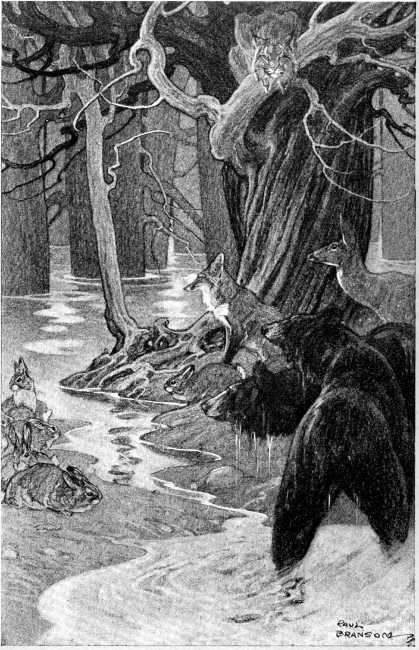 At first, because of the noise he made, the forest seemed to him to be empty of all living things but birds. Then one day, as he lay basking in the sun, he saw a wild-cat pounce upon a rabbit. At first he stared curiously. But when he saw the wild-cat feasting on her prey, he decided that he wanted the banquet for himself. As he burst through the bushes, the great cat stared for an instant in utter amazement, never having seen or dreamed of such an apparition. Then, her eyes like moons, her six-inch bob-tail fluffed to a bottle-brush, and every hair stiffly on end, she bounced into the nearest tree. There in a crotch she crouched, spitting and yowling, while her enemy tranquilly devoured the rabbit. The tit-bit was not altogether to his taste, but he chose to eat it rather than let the great cat have it. And, after all, it was something of a change from roots and fungi.