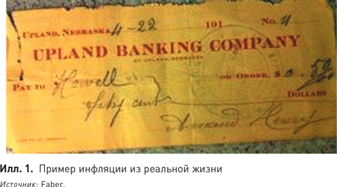 Несколько лет назад мы беседовали о чем-то с отцом, и он решил привести мне пример инфляции из реальной жизни. Пару недель спустя я получил от него письмо, в котором обнаружил чек на $0,50, выписанный моим прадедом еще в 1910-х гг. Прадед был фермером, иммигрировавшим из небольшого городка в департаменте Вогезы (Франция) и осевшим в штате Небраска. Тогдашние $0,50 эквивалентны сегодня почти $13, что очень наглядно демонстрирует инфляцию. Посмотрите, как выглядит этот заполненный от руки документ (илл. 1).