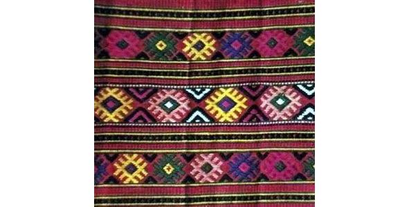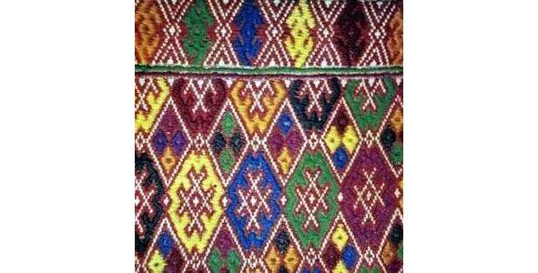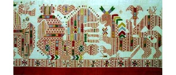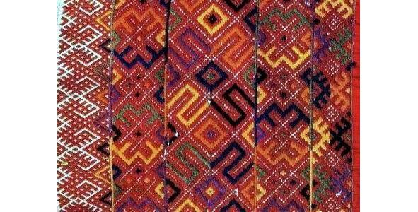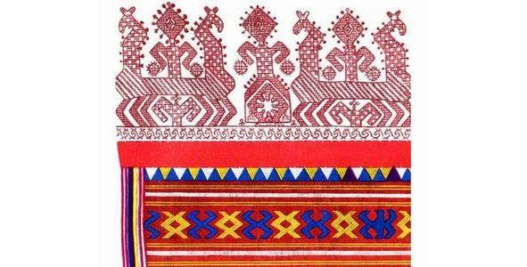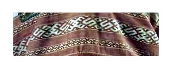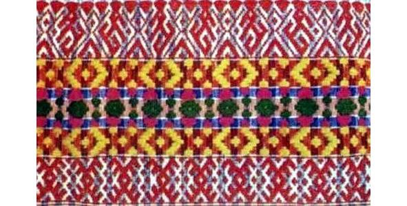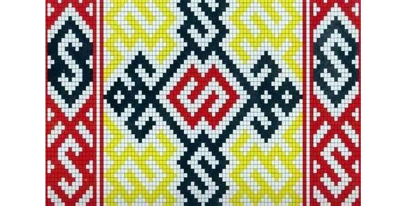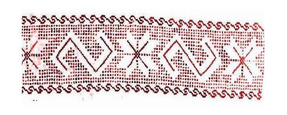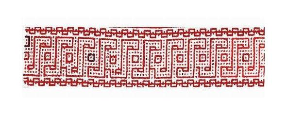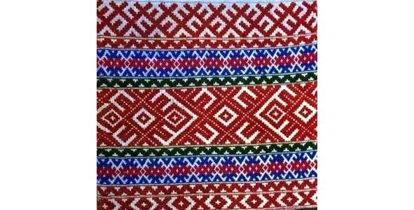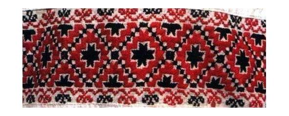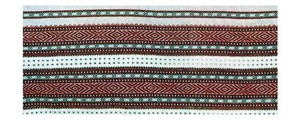 С развитием техники ткачества древние мастерицы неолита или энеолита смогли перенести сложные орнаменты из ромбов и меандров непосредственно в структуру ткани. Такой древний орнамент коврового типа, практически идентичный мезинскому и ранненеолитическому, можно без труда обнаружить на льняных холстах, бытовавших в северорусских деревнях еще в начале 20 века. Выполненные в многоремизной технике, они все сплошь покрыты ромбо-меандровым узором, получающимся при сложном переплетении нитей основы и утка. Из такого холста, как правило, делались полотенца, скатерти, юбки, к которым пришивались полосы проставок, набранных красными нитками по белому полю. Орнамент этих проставок зачастую очень похож на древний ромбо-меандровый, но в то время как фактура белого холста повторяет древние композиции практически без изменений, на проставках мы видим как бы фрагменты архаической схемы, её разделенные и сгруппированные по каким-то новым принципам детали.