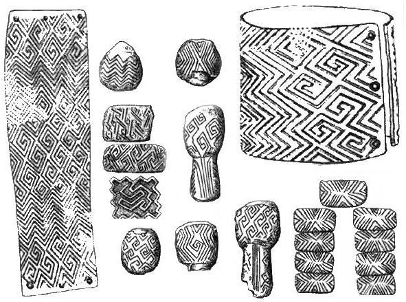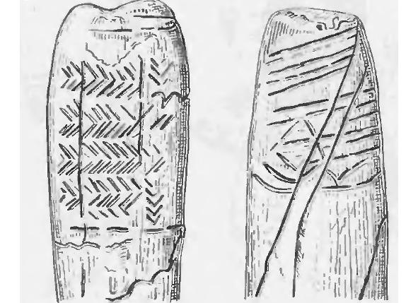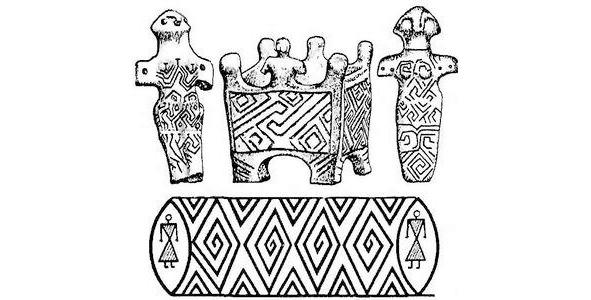 Надо сказать, что возможность такой вариабельности была заложена еще в мезинских орнаментах. Несмотря на внешнее сходство, орнаменты изделий с мезинской стоянки имеют целый ряд различий. Так на браслете выполнен коврово-меандровый узор, но на фигурках из бивня мамонта рисунок уже несколько иной: это меандровая спираль, помещенная среди зигзагов, параллельные полосы меандра и меандр, изображенный в движении справа налево и слева направо, в котором уже довольно отчетливо прочитываются очертания одного из самых распространенных в период энеолита и меди-бронзы на территории Восточной Европы знака — свастики (табл. 4). Эта орнаментальная дифференциация в неолите становится еще более очевидной. Так большое количество различных вариантов орнаментов, основанных на ромбо-меандровой палеолитической композиции, дают нам неолитические «печатки» (на которых можно найти и ряды — S — образных элементов меандра — «гуськов», и полосы меандров, и свастические элементы) и неолитические глиняные статуэтки, изображающие женщин, покрытые всевозможными мотивами меандровой композиции. Б. А. Рыбаков отмечает, что если меандровый узор широко применялся в неолите для орнаментирования керамики вообще, то «для ритуальной посуды и пластики он являлся почти обязательным».