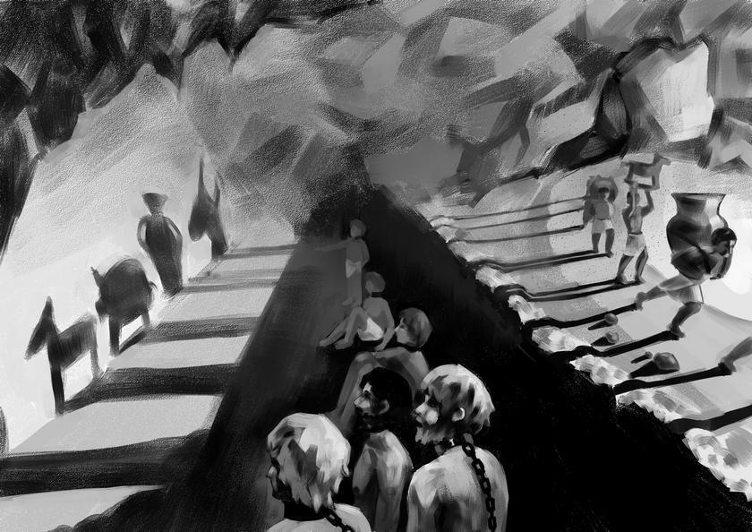 По какой-то никому не ведомой причине одного из узников решили освободить и показать ему настоящий мир. Когда он повернет голову, его начнет слепить огонь, он увидит людей и услышит их разговоры, ничего не поймет и захочет вернуться туда, откуда его вытащили, где все было просто и понятно.