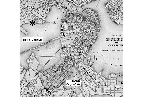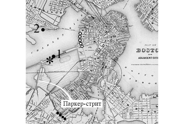 Посмотрим на карту Бостона, представленную ниже. Это карта 1852 г., на ней Ханнеман-стрит, где предположительно был убит Абия Эллис, ещё находится южнее южной границы города. Через 20 лет, ко времени описываемых событий, Бостон значительно расширился, и Ханнеман-стрит (она показана чёрным пунктиром) была уже глубоко внутри городской застройки. Посмотрев на карту, легко понять, что если убийца имеет намерение бросить труп в воду, то ему следует направиться к заливу Саус-бэй, расстояние до которого составляло 400 метров... ну пусть 500 или 600 с учётом огибания углов. Но топить труп в реке Чарльз, расстояние до которой 3 или даже 4 раза больше, крайне нерационально.