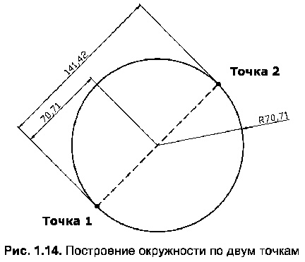 Построенная таким образом окружность с диаметром представлена на рис. 1.14, а протокол диалога AutoCAD и пользователя в этом случае будет иметь следующий вид (листинг 1.2).