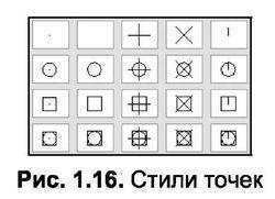 Точки характеризуются несколькими параметрами: координатами вставки, размером и разновидностью (стилем). Последний позволяет представить точку в различных форматах (рис. 1.16).