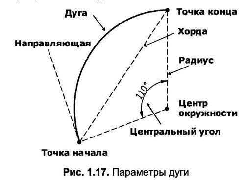 Что касается объекта «дуга», то он представляет собой часть окружности; и поэтому для вычерчивания дуги необходимы как характеристики окружности, так и собственные параметры дуги. К собственным характеристикам дуги относятся координаты ее начальной и конечной точки, длина хорды и центральный угол (рис. 1.17), а к характеристикам окружности можно отнести ее центр и радиус (или диаметр).