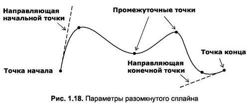 В общем случае, сплайн — это сглаженная кривая, проходящая через заданные пользователем точки. Бывают замкнутые и разомкнутые сплайны. Замкнутые сплайны, в отличие от разомкнутых, имеют общую точку начала и конца. Точки концов сплайна имеют направляющие – вспомогательные линии, исходящие из этих точек и проведенные касательно к кривой (рис. 1.18). Положение направляющих определяет кривизну сплайна в его начале и конце.