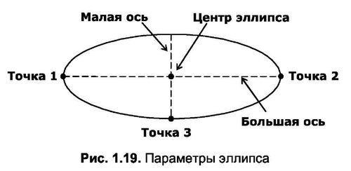 Эллипс, в отличие от окружности, не имеет диаметра и строится при помощи двух взаимно перпендикулярных осей, одна из которых больше другой (рис. 1.19). Если эти оси одинаковы, эллипс превращается в окружность. Таким образом, к основным геометрическим характеристикам эллипса, которые применяет AutoCAD при его построении, относятся координаты центра эллипса, а также размеры его большой и малой осей.
