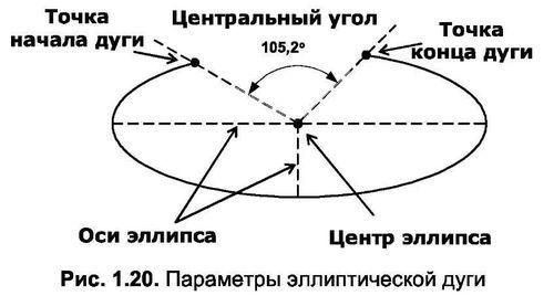 Эллиптическая дуга представляет собой часть эллипса, образованную отсечением его сектора двумя линиями, исходящими из центра эллипса. Угол между этими линиями называется центральным углом эллиптической дуги (рис. 1.20). Так как эллиптическая дуга является фигурой, производной от эллипса, при ее построении сначала необходимо начертить эллипс и только после этого указать характеристики дуги. Этими характеристиками, как видно на рис. 1.20, являются точки начала и конца дуги, а также ее центральный угол.