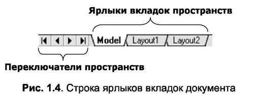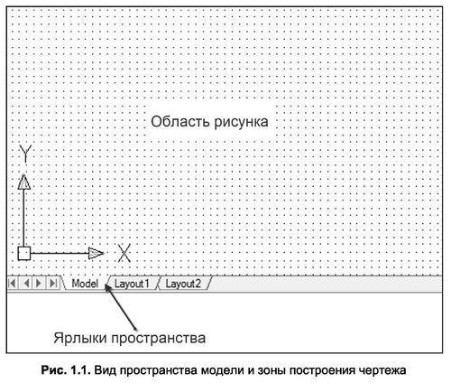 После запуска программы вам будет представлено пространство Model (Модель), предназначенное для выполнения всех графических построений и редактирования, а также еще два пока не подготовленных пространства листа, предназначенных для обработки документа перед печатью (рис. 1.1).