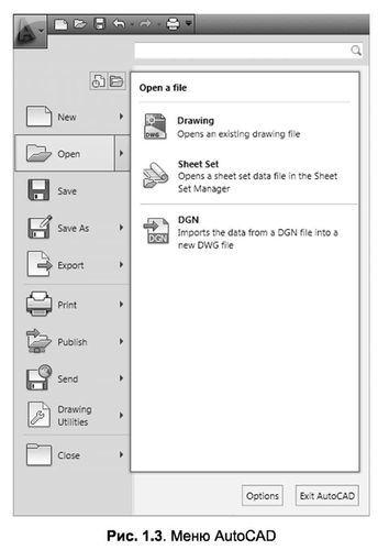 В правой нижней части меню находятся кнопки Options (Настройки) и Exit AutoCAD (Выйти из AutoCAD). Они позволяют соответственно изменить настройки и выйти из программы.