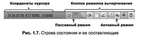 строка состояния — строка, содержащая информацию о координатах перекрестия курсора, а также о состоянии режимов вычерчивания;