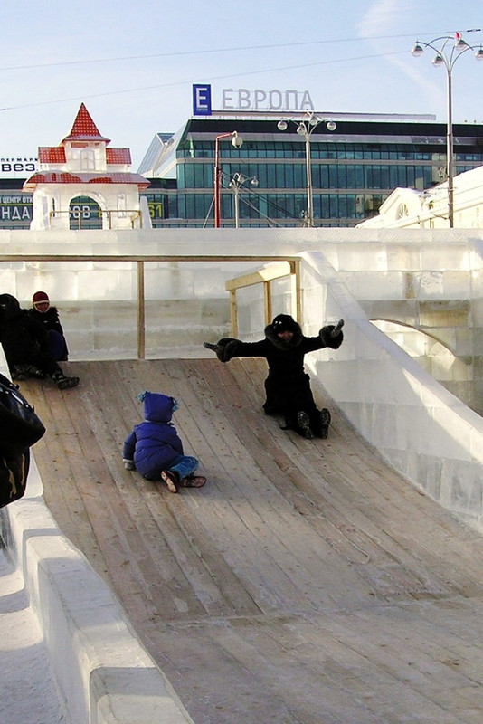 Иван Христофорович, прижавшись к барьеру, глядит на два самых счастливых лица, которые, схватившись за руки вместе, проносясь мимо него, скатываются вниз. Сергей от счастья хохочет, а Мария от удовольствия визжит. Первый раз. Второй. Третий.