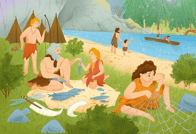— Такие лодки называются однодревками, потому что сделаны из одного дерева, выдолбленного внутри. Смотри, как радуются члены племени успеху охотников и рыбаков. Вождь уже начинает делёжку добычи.