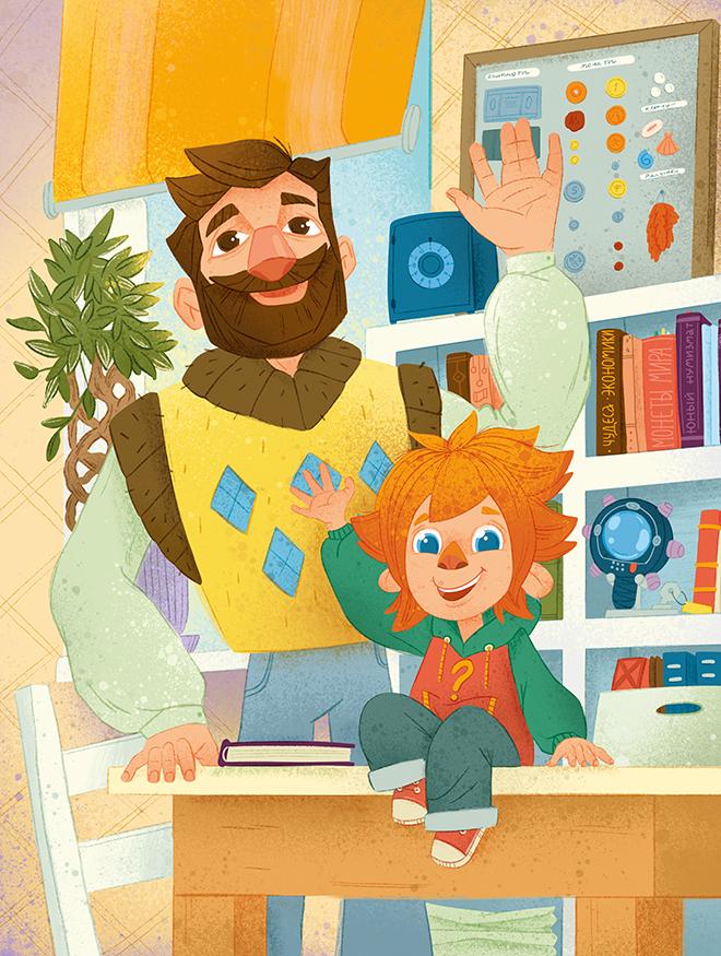 Здравствуйте, ребята! Меня зовут Чевостик. Я живу на книжной полке в библиотеке у дяди Кузи. Не удивляйтесь: я небольшого роста, а нижняя полка в книжном шкафу дяди Кузи очень высокая и просторная, поэтому мне на ней хорошо и удобно. Какой я? Похож на обыкновенного мальчишку, волосы рыжие, характер весёлый. Дядя Кузя в шутку зовёт меня Чевочкой с хвостиком. Но никакого хвоста у меня нет, зато есть ушки на макушке. Больше всего на свете я люблю узнавать новое, поэтому всё время задаю дяде Кузе всякие вопросы. О чём бы я ни спросил, он всё знает и мне рассказывает. Это потому, что дядя Кузя очень умный. Он прочитал много-много разных книг. А ещё мы с ним любим путешествовать! В путешествиях нам помогает времяскок. Это такой прибор, его дядя Кузя изобрёл. Набираешь на времяскоке место и время, куда хочешь попасть, раз, два — и уже там! Сегодня мы наверняка тоже куда-нибудь отправимся!
