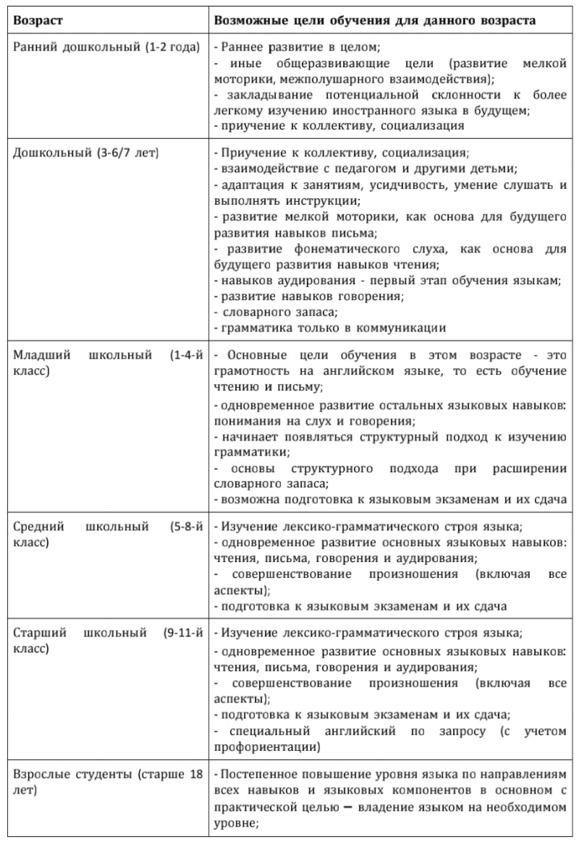 Любое обучение — это не просто посещение занятий, где преподаватель дает студентам каждый раз новый материал, который считает нужным или интересным. Все курсы должны иметь конечную цель, и она выражается в конкретных знаниях, умениях и навыках, которые ученик получит к концу курса. Например, программа по английскому языку для младших школьников имеет своей основной (но не единственной!) целью обучение чтению и письму на английском языке. Совершенно естественно, что ребенок, прошедший данный курс, к концу обучения должен уметь читать и писать на английском. В табл. 1 мы разберем некоторые цели при обучении иностранным языкам для разных возрастов.