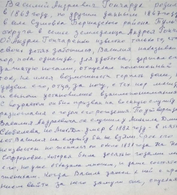 Мы знали, что это наш прадед, но фото я его не видел никогда. И папа часто рассказывал о Софроновне, потом мы узнали что Софроновна (Сафроновна) — это наша прабабушка. Андрей Гончаренко, мой прапрадед, был женат, к сожалению, имя жены не сохранилось, но у него было двое детей сын Василий и дочь.