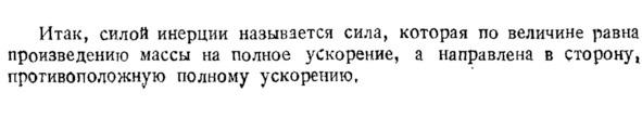 «Силой инерции называется сила, которая по величине равна произведению массы на полное ускорение, а направлена в сторону, противоположную полному ускорению» (см. фотокопию выше, «Теоретическая механика», издание второе, ГОСУДАРСТВЕННОЕ ИЗДАНИЕ ТЕХНИКО-ТЕОРЕТИЧЕСКОЙ ЛИТЕРАТУРЫ МОСКВА-ЛЕНИНГРАД 1952 г., §2 Сила инерции).