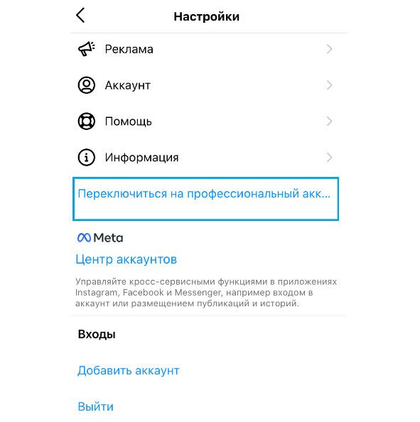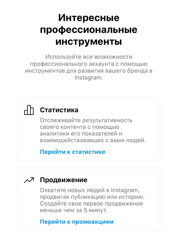 На главной странице своего профиля открываем Дополнительные инструменты –> Настройки –> Переключиться на профессиональный аккаунт.