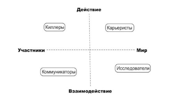 Какая часть целевой аудитории и как именно реагирует на игровые механики? Ричард Алан Бартл определил основные типажи «человека играющего», визуализировав модель, которая состоит из двух пересекающихся отрезков, образующих поле игроков, названное им плоскостью интересов: «Действие — взаимодействие» и «Игрок — система». На основании предпочтений, сформированных на тесте Бартла, игроки разделяются на четыре основных типа персонажей: киллеры, карьеристы, коммуникаторы, исследователи.