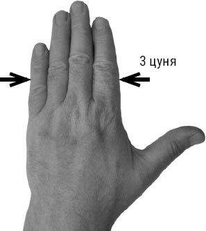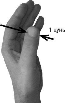 1 цунь – это ширина большого пальца левой руки (у мужчин) по линии, проходящей через угол ногтевого ложа (рис. 1). У женщин можно использовать для измерения обе руки, если род занятий не провоцирует уплощение правого пальца (как прядильное ремесло, например). 3 цуня – ширина 4 сомкнутых пальцев выпрямленной (правой или левой) ладони (рис. 2).
