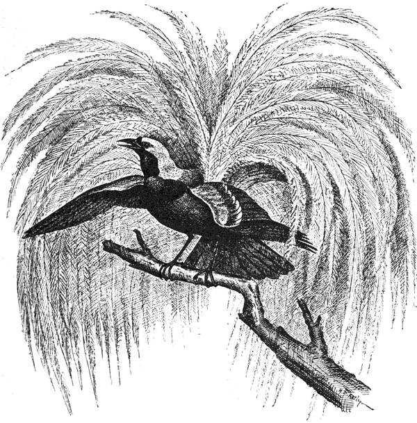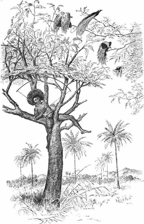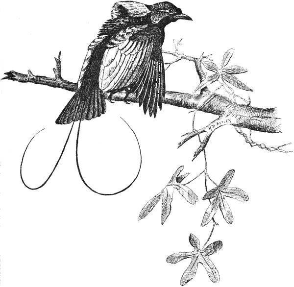 A long time ago—but long after the little demon had crept out of his cave—the early Portuguese voyagers (whom your mother will tell you about), when they came to the Moluccas to get spices, were shown the dried skins of beautiful birds which were called by the natives “Manuk dewata,” which means “God's birds.” There were no wings or feet to the skins, and the natives told the Portuguese that these birds had never had any, but that they lived always in the air, never coming down to settle on the earth, and keeping themselves all the while turned towards the sun. One would have thought they must have wanted wings, at any rate, to be always in the air, but that is what the natives said. So the Portuguese, who did not quite know what to make of it, called them “Passaros de Sol,” which means “Sun-birds” or “Birds-of-the-Sun,” because of their always turning towards him. Some time after that, a learned Dutchman who wrote in Latin (just think!), called these birds “Aves Paradisei”—Paradise Birds or Birds of Paradise—and he told every one that they had never been seen alive by anybody, but only after they had fallen down dead out of the clouds, when they were picked up without wings or feet, and still lying with their heads towards the sun in the way they had fallen. So, after that these wonderful birds were always called “Birds of Paradise.” That is one way of explaining how they got their names, but the other way, and perhaps you will think it a little more probable, is this.
