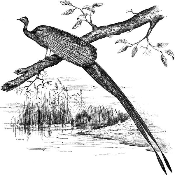 The people who live in that part of the world—those yellow people called Malays that I have told you of—know all about the ways of the Argus Pheasant, and how he will not have things lying about in his drawing-room. Now there is a great tall reed that grows there, called the bamboo, which I am sure you have heard of, and which your mother will tell you all about. The Malays cut off a piece of this bamboo, about two feet long, and then they shave it down—all except about six inches at one end of it—till it is almost as thin as writing paper. It looks like a piece of ribbon then, only, as it is very hard, as well as thin, its edges are quite sharp, and able to cut like a razor. But the piece at the end, which has been left and not shaved down, they cut into a point, so that it makes a peg, and this peg, that has a ribbon at the end of it, they stick into the ground, right in the middle of the Argus Pheasant's drawing-room. So, when the poor Argus Pheasant comes into his drawing-room, he sees something lying on the floor, which has no business to be there. It may be only a ribbon, but that is not the right place for it, so he tries to pick it up and throw it outside. But it won't come, however much he pulls it, for the peg at the end is fixed in the ground, and he is not strong enough to pull it out. At last he gets angry and thinks he will make a great effort. He twists the long ribbon round and round his neck—just as you would twist a piece of string round and round your hand if you were going to pull it hard—then takes hold of it with his beak, just above the ground, and gives quite a tremendous spring backwards. You may guess what happens. The long peg does not come out of the ground, but the ribbon is drawn quite tight round the poor bird's own neck, and the sharp edges almost cut his head off.