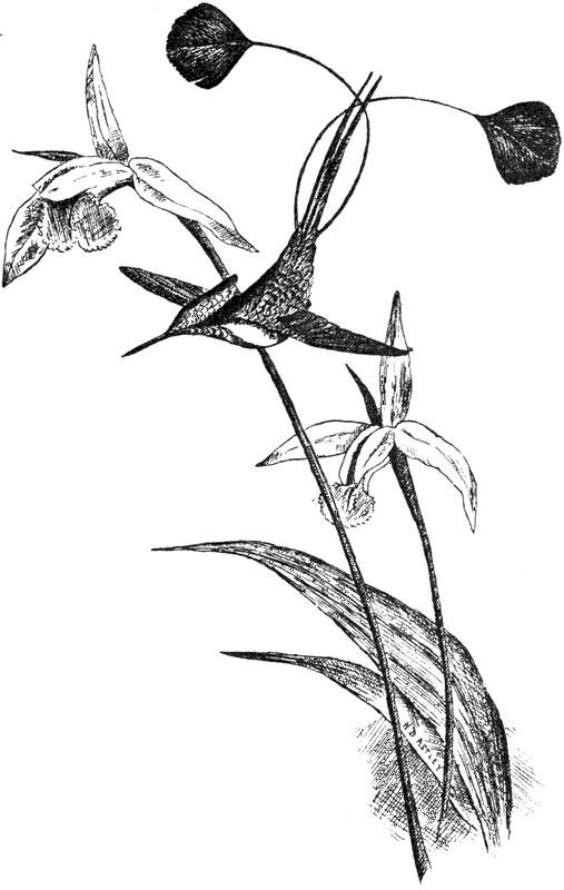 Princess Helen's Coquette (how proud he ought to be of a name like that!) is a little Humming-bird something like the last one. He is a little smaller, I think, but whether he is a little prettier, too, or not quite so pretty, or only as pretty, all that I shall leave to you; it is you who will have to decide. His back is all of a golden green, and his head, which has a forked crest at the back of it like a swallow's tail, is a beautiful, rich, dark, velvety green, so that would make a pretty little bird—would it not?—even without anything else. But he has something else—two or three other things in fact—which are so—oh, so very pretty. First, on each side of the back of the head—just under each fork of the little swallow-tailed crest—there is a little delicate tuft of feathers, which rise up and spread out upon each side in such a graceful little curve. But these feathers are not like other feathers. They are something like the “funny feathers” that the Birds of Paradise have, for they are quite thin, like threads, and an inch long, which (although it is not quite so long as those) is yet a good length when you think of what a little thing this little Humming-bird is. These pretty little feathers are of a deep velvety green colour—the same colour as his swallow-tailed crest—and there are three on each side, three little velvet green feather-threads, floating out on each side behind his head. On his throat there is a gorget of gleaming, jewelly green, much lighter than the other greens—more like emerald, but with a goldeny, bronzy wash in it, as well. Just think how beautiful that must be! And then, lower down on his throat, underneath the green gorget—as if all that were not enough for him—this Humming-bird has something else—we will call it a tippet—which flies out all round his neck, and, especially, on each side of it. A tippet or a ruffle—perhaps that is rather a better word—a ruffle of velvet black feathers in front, and of light chestnut feathers with velvet black stripes—like a tiger—on each side. As for his tail, it spreads out into a dear little fan, and the fan is chestnut and black too, broad stripes of chestnut and narrow stripes of black, with a broad patch of black where it begins, which looks like the handle of the fan. What a pretty, pretty bird! Fancy a little birdie that is only about two inches long, and has a crest like a swallow-tail on his head, a gorget—or lappet—on his throat, a tippet—or ruffle—just underneath the gorget, and a little spray of feather-threads on each side of his head, just underneath the crest! Fancy killing such a little fairy-bird as that! Fancy wanting to kill him! But it is all the little demon. It is he who has blown about his nasty powders and frozen the hearts of the poor women, who are really so kind—at any rate they would be if only he would let them.