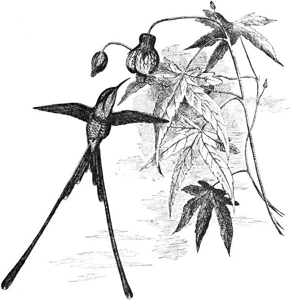 Yes, a sun, because he is so very bright. He has a gorget (or perhaps you would prefer to call it a lappet) of feathers on his throat and breast, of the most glorious, radiant green colour, and from it there shoot out—one on each side—a pair of the very loveliest and most delicate little fairy-wings that ever you never saw—for I feel sure that you never have seen anything at all like them. I do not mean, of course, that they are real wings, to fly with, no—it would be funny if a bird had two pairs of that kind—but ornamental ones, wings for the little hen Humming-bird, who has none, to look at and say, “How beautiful! How extraordinarily becoming!” Each of these dear little wings is made by a few delicate, long, slender feathers of a light chestnut colour, the same as the feathers of the crest, only, instead of being tipped with black, these ones are tipped with a spot of the same lovely green that there is on the throat and breast. The longest of them, which is in the middle, is nearly an inch long—which is very long indeed when you think how small the little birdie is—and it stands out a quarter of an inch beyond the two next longest ones on each side of it, and these are almost a quarter of an inch longer than the ones that come next. If you hold out your hand with the fingers spread out, and imagine the middle one a good deal longer and the little finger and thumb much shorter, then you will know the shape of these dear little fairy-wings; only, of course, feathers are much more elegant than fingers—even than pretty little fingers. Think how pretty something in muslin or puff-lace, like that, on a dress would be!—but it is ever, oh, ever so much prettier on a little Humming-bird, in little chestnut feathers with little green spangles at their tips. And that is why I call them “fairy-wings,” for I think if any pair of wings that are not a fairy's could be pretty enough for a fairy, those would be the ones.