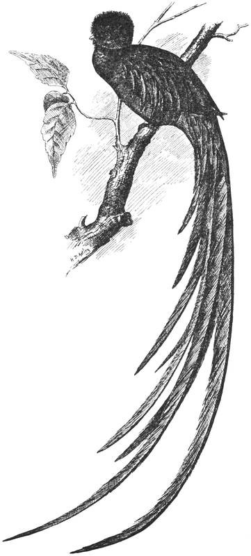 Well, now, I will tell you what this beautiful bird, the Quezal or Resplendent Trogon, that used to be in King Montezuma's aviary, is like. It is about the size of a turtle-dove, but with the most beautiful, long, curling feathers in its tail, and these beautiful feathers, and all the feathers on its back and breast and on its head, too, are of the most lovely, rich, golden-green colour. Really I don't know whether there is more of gold or of green in them, but there is just the right quantity of each to make them the most beautiful, beautiful feathers you can possibly imagine. It is the tail-feathers that are the most beautiful, for they are so very long—the two longest are much longer than those in a pheasant's tail—but there are some feathers which begin on the back and lap softly round the sides, one a little way off from the other, so that you see their pretty shapes, and these are almost as beautiful, although they are ever so much shorter. But now there is something funny about those long feathers, which I have called the tail-feathers, and that is, that they are not really tail-feathers at all. They look as if they were, but really they are feathers which go over the tail and cover it up, so that the real tail is underneath them. It is like that—though I am sure you never knew it—with the peacock; those beautiful, long feathers which we call the tail are not really the tail, and you will see that, directly, if you watch a peacock when he spreads them out, for, as soon as he does, you will see the real tail underneath, which is nothing very particular to look at. Still, in both these birds the long feathers look so like the real tail that we may very well call them the tail-feathers, and we can always explain about it afterwards, to show how much we know. And, do you know, these beautiful, long, golden-green feathers of the Quezal, which we are going to call the tail-feathers, although we know very well they are not, were so highly valued by these people who used to live in Mexico, that no one was ever allowed to kill the bird, but only to catch it and cut them off and let it go again, so that new ones might grow on it. And only the chiefs were allowed to wear its feathers. And, indeed, there would be no great harm in wearing feathers in hats, if we got them only in that way. Only I cannot think what the little demon could have been about in that country. A law like that must have made him very angry indeed.