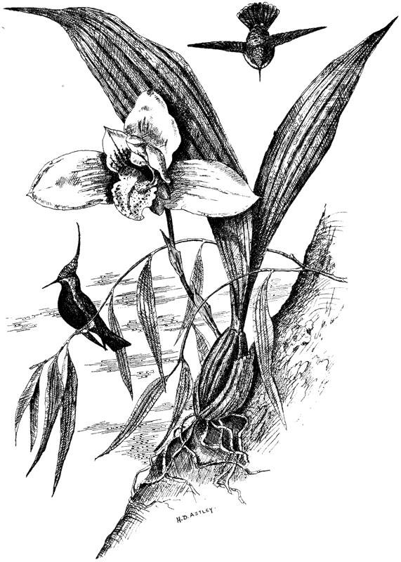 Well, that is eight Humming-birds that I have tried to describe to you (though it is very like trying to describe a sunset to some one who has never seen one), and perhaps you think I have chosen all the most beautiful ones first, and that there are no more left which are quite so pretty. But I think I can find just one more that is not such a very plain bird, not a bird you would call ugly if you were to see it hovering about over a bed of geraniums or under a cluster of honeysuckle, some bright spring or summer morning when you happened to go out into your garden. So we will take that one, and, if he is not pretty enough, you must just try to put up with him.