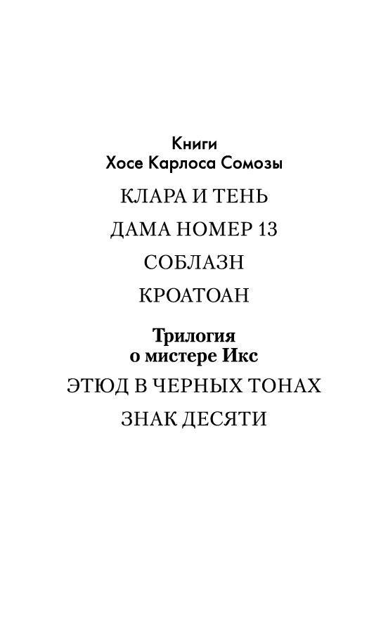Хосе Карлос Сомоза — блистательный испанский писатель, чьи романы переведены на несколько десятков языков, лауреат премии «Золотой кинжал» и обладатель множества других литературных наград, создатель многослойных миров, где творятся очень страшные дела, автор фантастических, философских, исторических триллеров и хорроров. В «Знаке Десяти», продолжении «Этюда в черных тонах», возвращаются инфернально проницательный мистер Икс и его верная, ироничная, сильная и чувствительная медсестра Энн Мак-Кари, а вместе с ними в непредсказуемой интриге замешаны актеры, бутафоры и зрители жестоких подпольных театров, известные психиатры и, разумеется, Артур Конан Дойл.