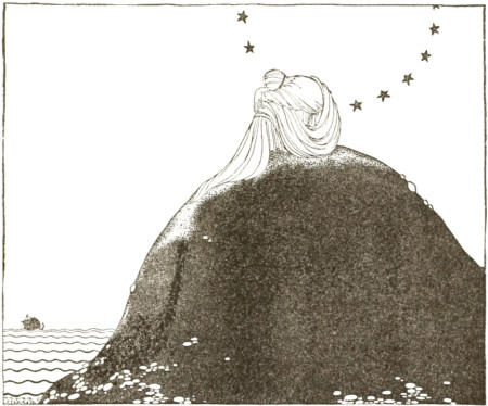 Immediately the fifty heroes got on board, and seizing their oars, held them perpendicularly in the air, while Orpheus (who liked such a task far better than rowing) swept his fingers across the harp. At the first ringing note of the music, they felt the vessel stir. Orpheus thrummed away briskly, and the galley slid at once into the sea, dipping her prow so deeply that the figure head drank the wave with its marvellous lips, and rising again as buoyant as a swan. The rowers plied their fifty oars; the white foam boiled up before the prow; the water gurgled and bubbled in their wake; while Orpheus continued to play so lively a strain of music, that the vessel seemed to dance over the billows by way of keeping time to it. Thus triumphantly did the Argo sail out of the harbor, amidst the huzzahs and good wishes of everybody except the wicked old Pelias, who stood on a promontory, scowling at her, and wishing that he could blow out of his lungs the tempest of wrath that was in his heart, and so sink the galley with all on board. When they had sailed above fifty miles over the sea, Lynceus happened to cast his sharp eyes behind, and said that there was this bad-hearted king, still perched upon the promontory, and scowling so gloomily that it looked like a black thunder cloud in that quarter of the horizon.