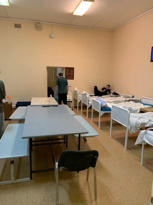 Входим в мужскую палату. Она представляет собой помещение площадью 60—70 кв. м, по обеим сторонам которого расставлены горизонтально, параллельно друг другу кровати — по 6 с каждой стороны. В центре — длинный стол с банкетками для приема пищи. В дальней стене три углубления: в крайнем левом — туалет и закуток кастелянши, в центральном — душ и курилка, в правом — маленькая 3-местная палата, предназначенная для изоляции простудных больных, а в действительности выполняющая роль «вип-камеры» для более или менее интеллигентных и тихих подэкспертных.