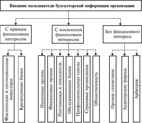 При построении данной схемы, а также при последующем описании интересов внешних пользователей бухгалтерской информации использованы следующие материалы: Кутер М.И. Теория бухгалтерского учета: Учебник. Изд. 2-е, перераб. и доп. – М.: Финансы и статистика, 2003; Соловьева О.В. МСФО и ГААП: учет и отчетность. М.: ФБК-ПРЕСС, 2004; Концепция бухгалтерского учета в рыночной экономике. Одобрена Методологическим советом по бухгалтерскому учету при Минфине России и Президентским советом Института профессиональных бухгалтеров 29 декабря 1997 г.; Кондраков Н.П. Бухгалтерский учет: Учеб. пособие. Изд. 4-е, перераб. и доп. М.: ИНФРА-М, 2001; Новодворскш В Д., Хорт АН. Цели и сущность бухгалтерского учета // Бухгалтерский учет. 1996. № 10. С. 19–21.