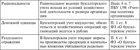 Отечественные учетные принципы (см. табл. 1.1), называемые требованиями и допущениями, закреплены законодательно в Федеральном законе «О бухгалтерском учете» и ПБУ 1/98 «Учетная политика организации», утвержденном приказом Минфина России от 9 декабря 1998 г. № 60н.