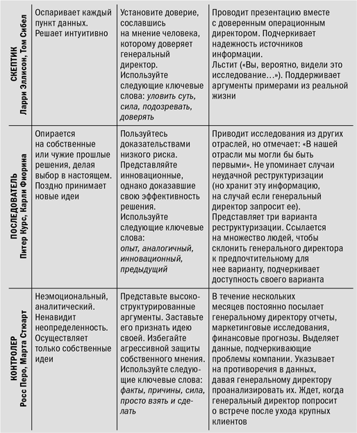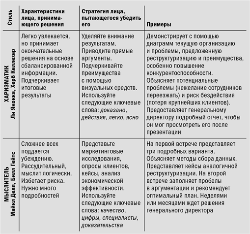 Эти пять стилей охватывают множество моделей поведения и характеристик. Например, контролеры всячески избегают риска, харизматики стремятся к нему. Несмотря на различия, люди часто пользуются универсальным методом, пытаясь убедить своих начальников, коллег и других сотрудников. Они доказывают свою правоту мыслителю так же, как доказывали бы скептику. Однако менеджерам следует корректировать свои презентации для руководителей, которых они стараются убедить, используя подходящие ключевые слова, чтобы донести необходимую информацию в наиболее эффективной последовательности и формате. В конце концов, Билл Гейтс принимает решения не так же, как Ларри Эллисон. Понимая это, можно добиться впечатляющих результатов.
