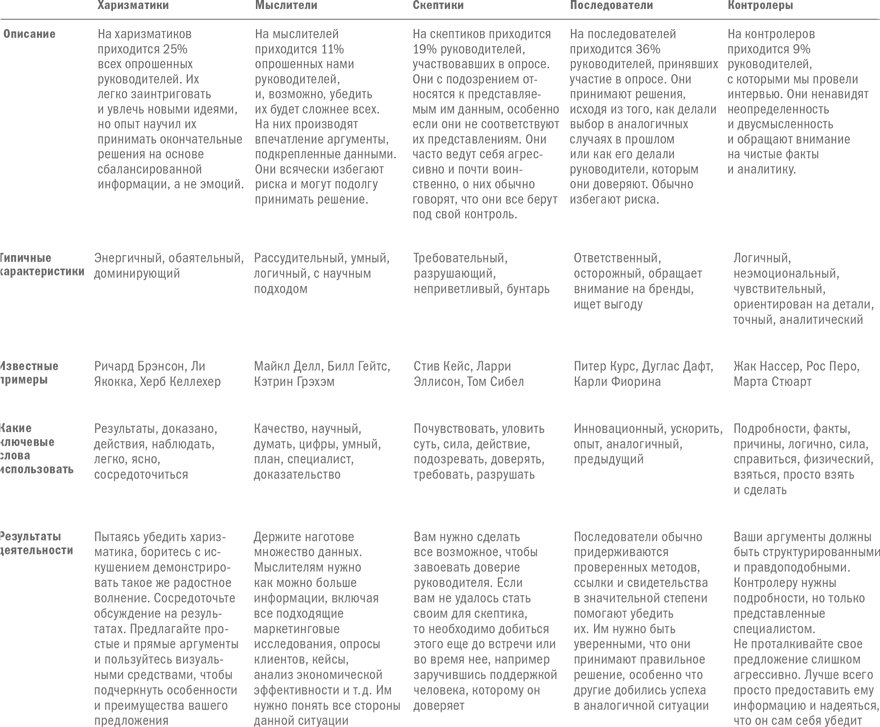 Если говорить более конкретно, мы обнаружили, что руководители, как правило, попадают в одну из пяти категорий принятия решений. Харизматики поначалу могут бурно реагировать на новую идею или предложение, но принимают окончательное решение на основе сбалансированной информации. Мыслители во время встречи демонстрируют противоречащие друг другу точки зрения и нуждаются в тщательной проработке всех вариантов, прежде чем придут к решению. Скептики крайне подозрительно относятся к данным, не соответствующим их представлениям, и принимают решения интуитивно. Последователи принимают решения, исходя из того, как другие руководители или они сами принимали аналогичные решения в прошлом. Наконец, контролеры сосредоточены на голых фактах и аналитике решения по причине собственных страхов и неуверенности.
