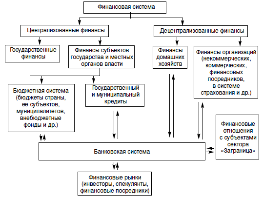 Логика приведенной схемы достаточно очевидна. На ней представлены все упоминавшиеся выше субъекты финансовых отношений, аккумулирующие фонды денежных средств и использующие их в соответствии с собственными потребностями. Поскольку в развитой рыночной экономике ни один из этих субъектов не может быть самодостаточным и/или не желает самоизоляции от других субъектов, между ними устанавливаются определенные финансовые отношения, осуществляются переливы ресурсов, в том числе и финансовых, от одного субъекта к другому. Как правило, коммерческие и финансовые операции между субъектами осуществляются через банковскую систему, которая и представлена в центре схемы.