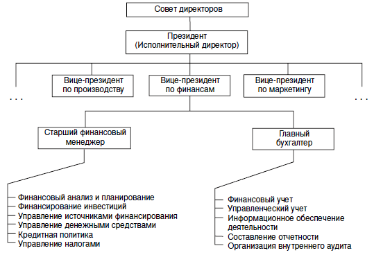 Организационная структура системы управления финансами хозяйствующего субъекта, а также ее кадровый состав могут быть построены различными способами в зависимости от размеров предприятия и вида его деятельности. Как отмечалось выше, для крупной компании наиболее характерно обособление специальной службы, руководимой вице-президентом по финансам (финансовым директором) и, как правило, включающей бухгалтерию и финансовый отдел.