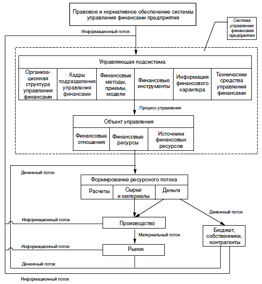 В терминах финансов предприятие может быть представлено как совокупность притоков и оттоков денежных средств, имеющих место в результате ранее сделанных инвестиций. Для того чтобы совокупность этих потоков была оптимальной, в любом предприятии формируется некая организационная структура управления финансами. Эта структура призвана не только оптимизировать ресурсный поток, но и обеспечить реализацию описанных выше основных функций финансов.