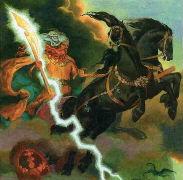 Перкунас — бог грома и молний, воинов и моряков. Совпадения со славянским Перуном и ведийским Индрой прозрачны до полного аналога: его воплощение — дуб, он ездит на колеснице по небу, у него рыжая борода и рогатый шлем, а также огромная секира или молот в руке. Он один из древнейших богов индоевропейцев, оттого так поразительно сходство между уже указанными, а также скандинавским Тором, хеттским Перкуном, римским Юпитером.
